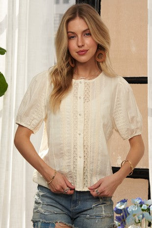 Vintage charm meets everyday elegance in The Adora Lace Panel Blouse. Featuring intricate lace accents down the front, delicate pintuck detailing, and gently gathered puff sleeves, this cream beauty adds a soft, romantic touch to any outfit. The pearl button-down front and lightweight fabric make it as versatile as it is flattering. Pair it with distressed denim or a flowy midi skirt—Adora is made to elevate your look.